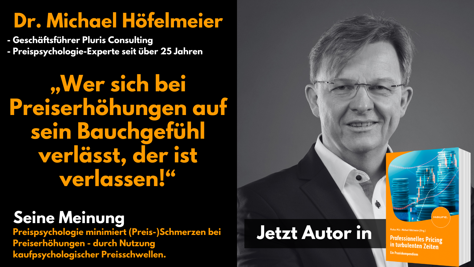 P.S.: Dr. Michael Höfelmeier, Geschäftsführer von Pluris Consulting, ist einer der beiden Herausgeber des am 20.11.2023 erschienenen Buchs "Professionelles Pricing in turbulenten Zeiten". Dort teilen 35 Experten ihr Praxiswissen rund um das Thema Pricing in 29 spannenden Beiträgen. Ergänzt wird dies durch eine aktuelle Pricing-Studie von Pluris Consulting und Milz&Comp., die den aktuellen Status, Trends und Entwicklungen inklusive Handlungsempfehlungen aufzeigt.